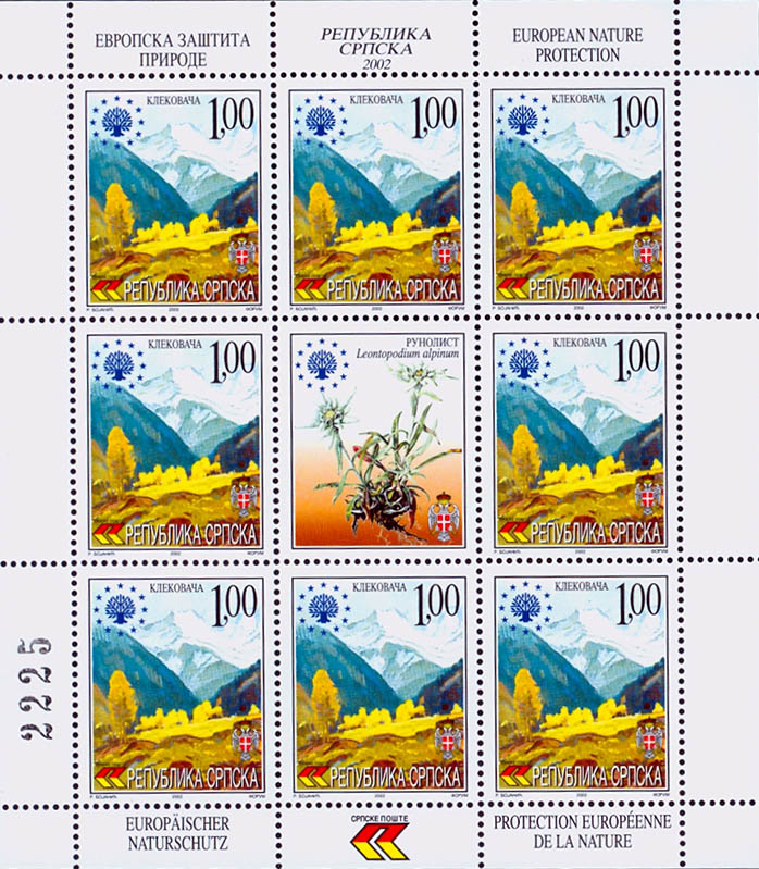 Naziv izdanja: Evropska zaštita prirode Datum izdanja: 26.11.2002. Autor: Radomir Bojanić Vrsta izdanja: prigodno Tehnika štampanja: višebojni ofset Šalterski tabak: 8+1 komad (3x3) Papir: kredast Štamparija: FORUM - Novi Sad