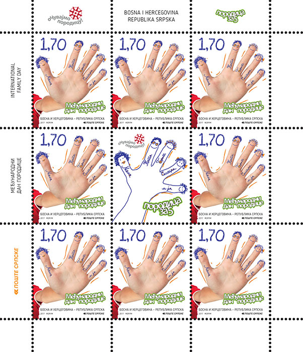 Naziv izdanja: Međunarodni dan porodice Datum izdanja: 15.05.2017. Autor: Nebojsa Đumić Vrsta izdanja: prigodno Tehnika štampanja: višebojni ofset Šalterski tabak: 8+1 Papir: muflep 100g Štamparija: Forum, Novi Sad