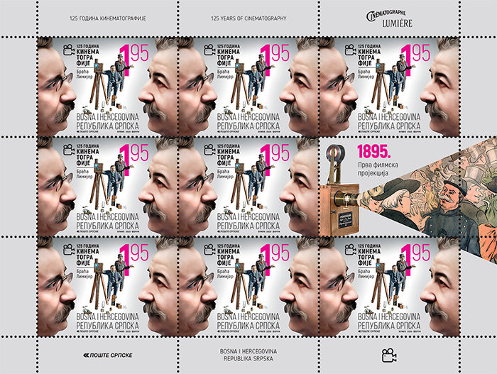 Prva filmska projekcija organizovana je 28. decembra 1895. godine u pariskom restoranu “Gran kafe”, čime je započeta svjetska kinematografija, a zasluge idu braći Luju i Ogistu Limijeru.Zapravo, prve “pokretne slike” bili su kratki dokumentarni filmovi na kojima su prikazani – radnik koji izlazi iz fabrike, željeznička stanica prepuna ljudi i voz koji juri. Braća Limijer bili su francuski hemičari, industrijalci, pronalazači i autori prvog filma koji je prikazan u istoriji. Luj je razvio metod za pravljenje fotografskih ploča 1882. godine, a do 1894. godine u fabrici koju su braća zajedno osnovala, u kojoj se izrađivao fotografski materijal – hartije i hemikalije – proizvedeno je 15 miliona ploča svake godine. Braća Limijer se ističu svojim pronalaskom – prenosivom kamerom koja ima ručno upravljanje, zahvaljujući kojoj je bilo moguće snimanje portreta, prizora iz života. Godinu dana poslije prve projekcije kratkih dokumentarnih filmova braća Limijer su napravila više od 40 filmova, snimajući svakodnevni životu u Francuskoj. Pravili su i prve filmske žurnale i slali ekipe da snime novi materijal širom svijeta. Svojim filmovima postavili su i temelje za određene filmske žanrove. Braća Limijer su napravila projekciju i prvu filmsku komediju, koja je ujedno i prvi narativni film, pod nazivom “Poliveni polivač”. Prva projekcija filmova ostavila je publiku bez teksta, dok je jedan od novinara tada zabilježio da je to “nesumnjivo najčudniji pronalazak u našoj epohi”. Autor: Nebojša Đumić Izdavač: Pošte Srpske a.d. Banja Luka